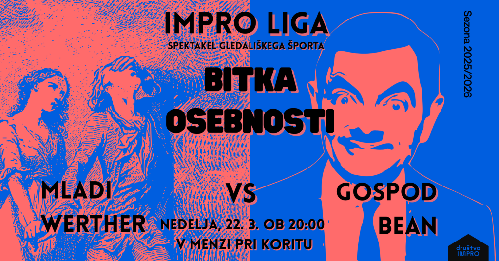 Impro liga: Bitka osebnosti – Mladi Werther vs Gospod Bean (Nedelja, 22.3.2026 ob 20h)