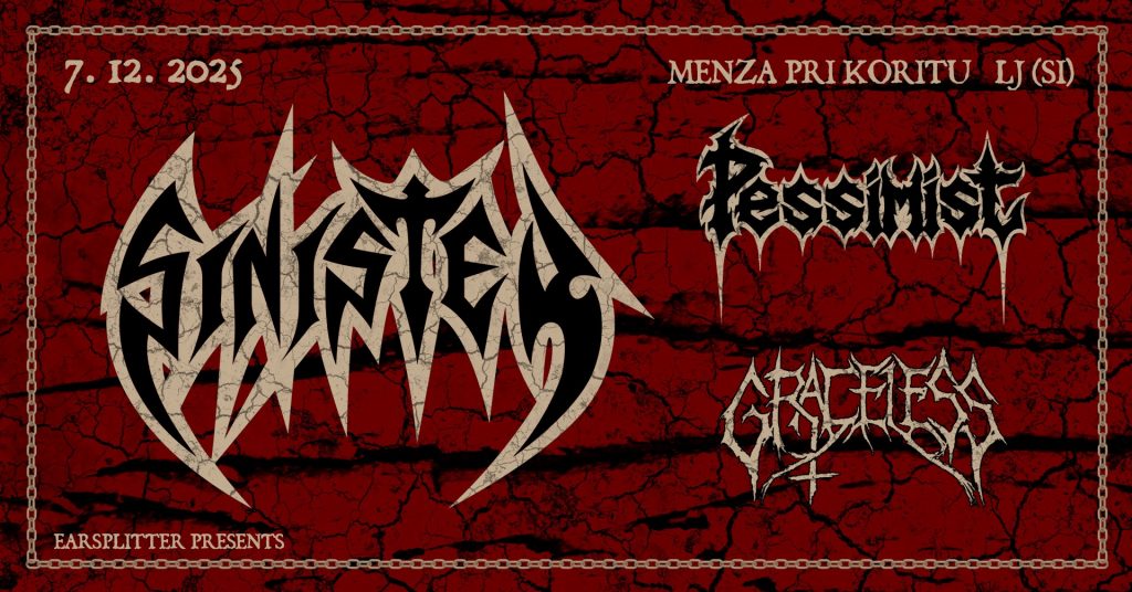 Po odličnem koncertu v Tolminu ’24, se v Slovenijo vrača nizozemsko-slovenska death metal naveza SINISTER! S seboj bodo tokrat pripeljali še ameriške black death legende PESSIMIST in nizozemski death doom kvartet GRACELESS. Pripravite se na old school brutalizacijo leta!